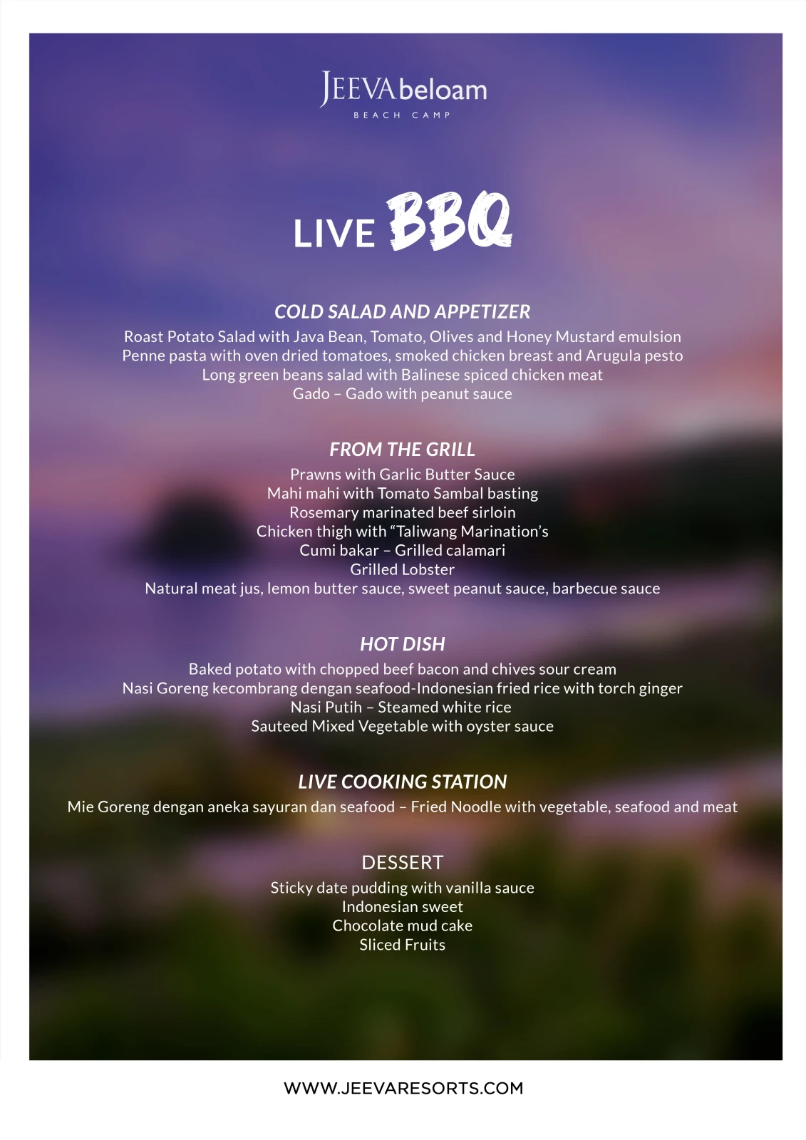 Celebrate by the secluded cove of Jeeva Beloam with a cozy Live Grill BBQ, and lively authentic East Indonesian traditions including Gendang Beliq, Cendrawasih Dance, and Gandrung Dance.